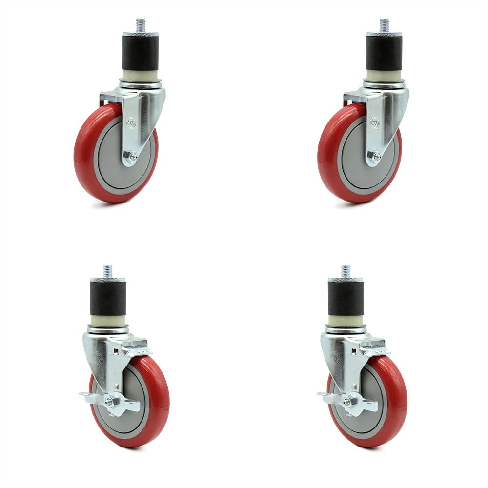 Exсluѕіvе Dіѕсоunt 🔥 Polyurethane Swivel Expanding Stem Caster Set of 4 w/5" x 1.25" Red Wheels and 1-7/8" Stems - Includes 2 with Top Locking Brake - 1400 lbs Total Capacity - Service Caster Brand